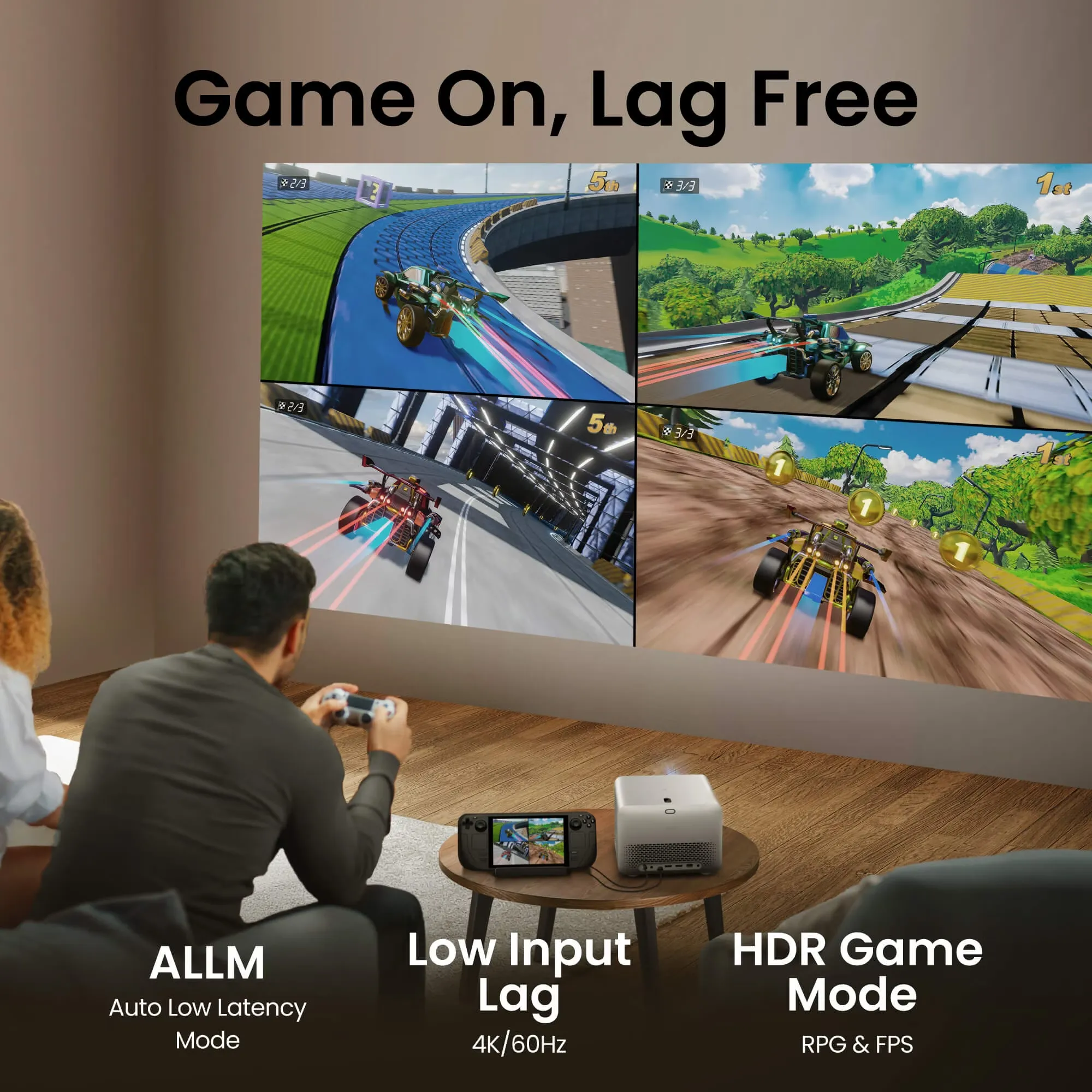 Built for gamers, this projector features HDMI 2.1 with Auto Low Latency Mode (ALLM) and an ultra-fast 5ms input lag at 4K/60Hz, offering smooth, lag-free gameplay on modern consoles. Dedicated HDR game modes further optimize visuals for immersive gaming experiences.