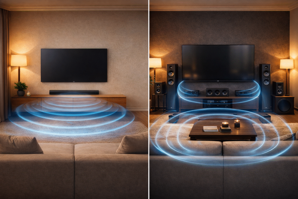 When comparing soundbar vs home theatre system in India, the biggest difference comes from how sound moves around the listener and creates immersion.